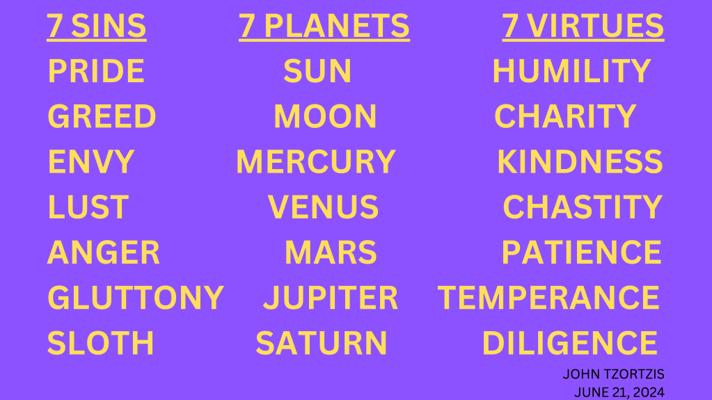 I created this chart below and it correlates ‘The 7 Deadly Sins‘ with ‘The 7 Lively Virtues’ along together with ‘The 7 Personal/Social/Energetical Planets’: